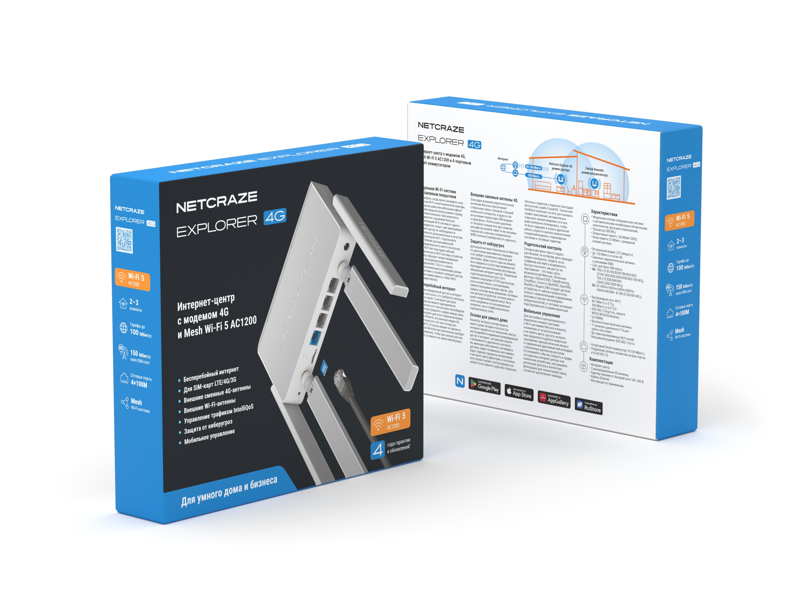 Это доступная 100-мегабитная модель с встроенным LTE/4G/3G-модемом, куда можно вставить SIM-карту любого оператора и подключиться к мобильному интернету на даче или торговой точке, в съемной квартире или гараже. Здесь есть двухдиапазонная сеть Wi-Fi 5 AC1200, резервирование интернета через нескольких провайдеров (Multi WAN), туннельные клиенты и серверы по всем актуальным протоколам, облачное управление через сервис CrazeDNS или приложение, VLAN’ы и сегментация, фильтрация контента и родительский контроль, гостевая сеть c Captive Portal и расписание работы функций. Для расширения покрытия беспроводной сети Explorer 4G готов к роли контроллера Mesh Wi-Fi-системы Netcraze. На большом удалении от базовых станций можно использовать уличную LTE-антенну.